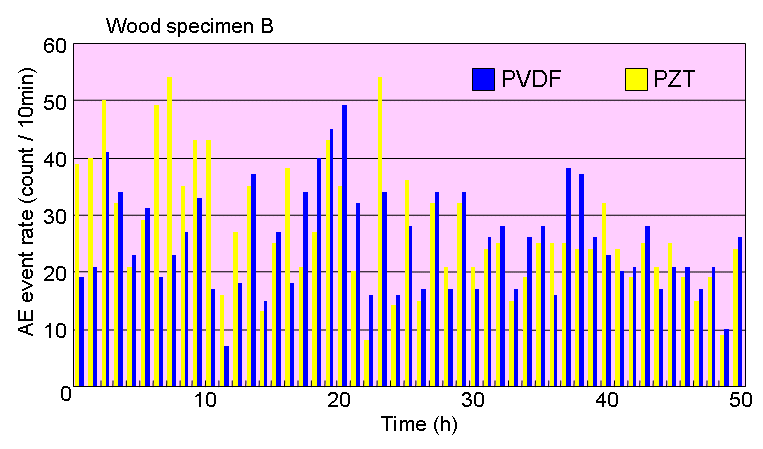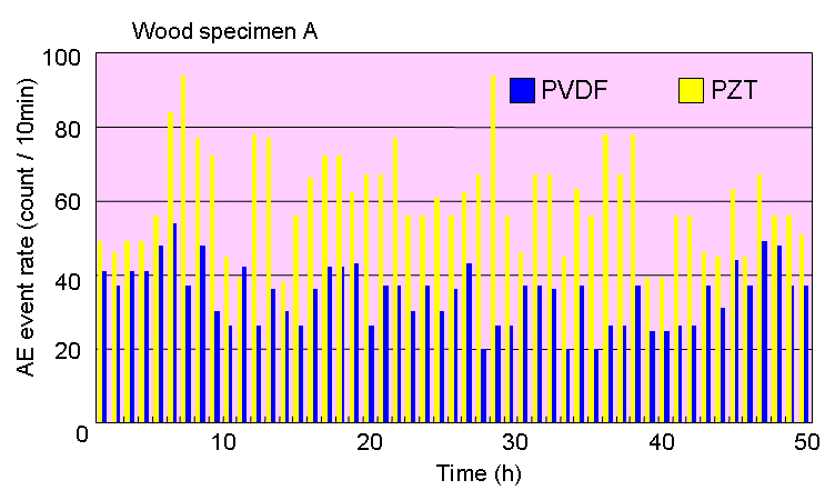 ![]() Fig. 5. AE event rates detected by PVDF films or AE transducers at the wood specimen A or B |