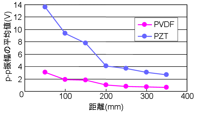 ![]() Fig. 3. 擬似AE波のp-p振幅と検出距離の関係 |