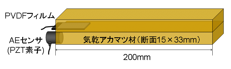 ![]() Fig. 4. 餌木で挟み込んだPVDFフィルムと木口面へ取り付けたAEセンサ |